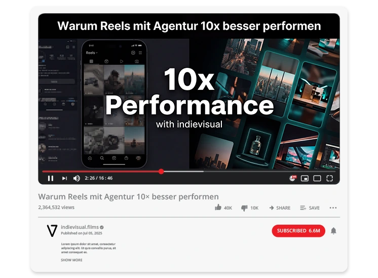 Mit unseren maßgeschneiderten Instagram Reels ziehst du die Aufmerksamkeit deiner Zielgruppe magisch an. Indievisual ist deine erfahrene Reel-Agentur, die Kurzvideo-Content in höchster Qualität liefert – von der kreativen Idee bis zum letzten Feinschliff im Schnitt. Dominiere deinen Markt und werde als Experte wahrgenommen, ohne selbst wertvolle Zeit in die Videoproduktion investieren zu müssen.